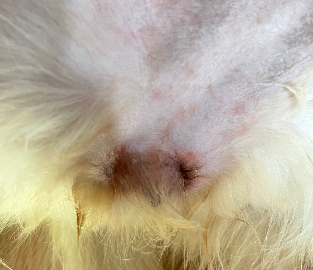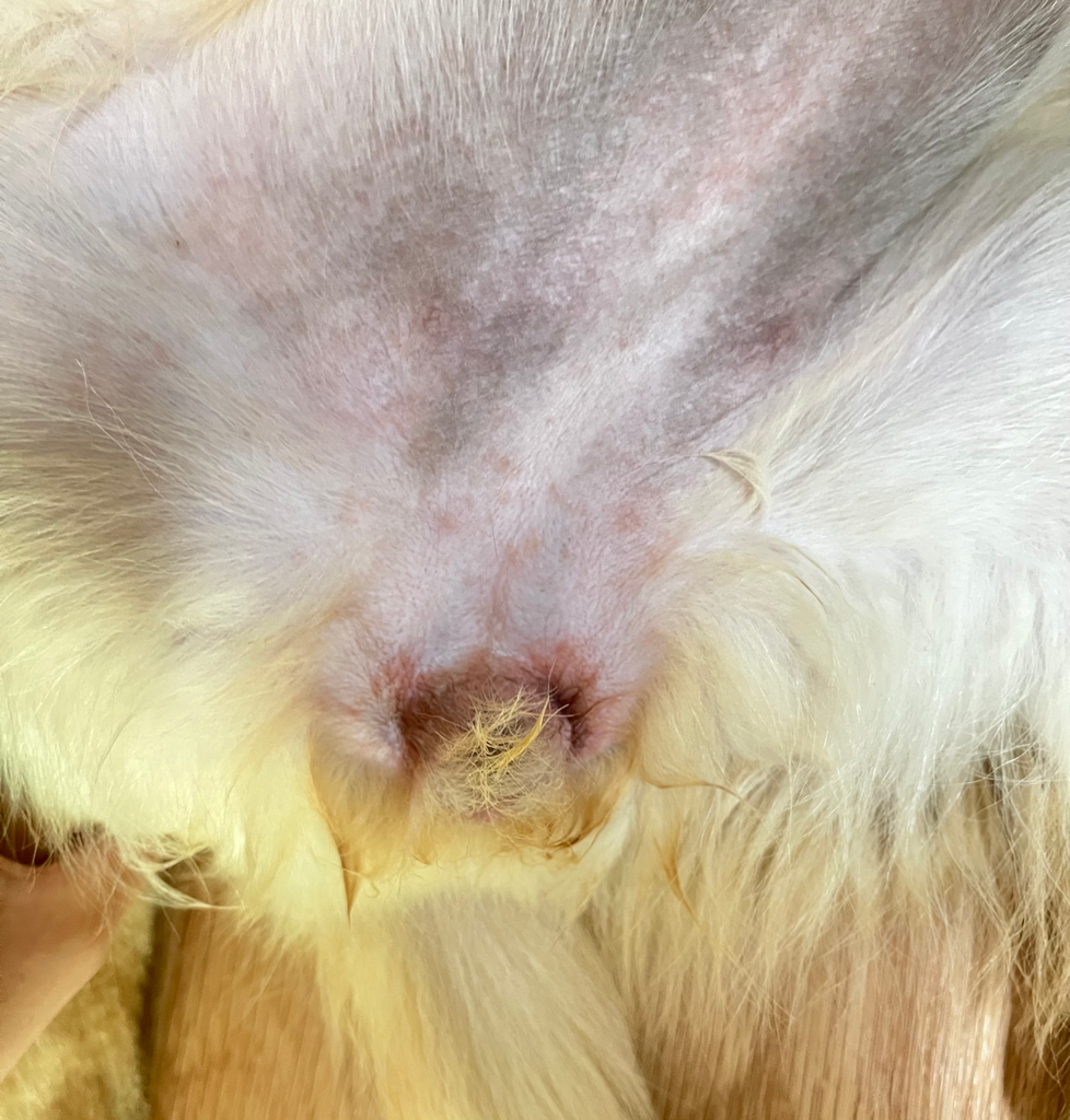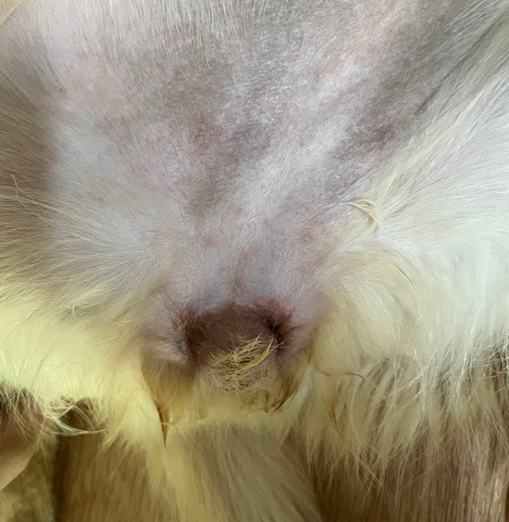 생식기 주변에 있는 털을 밀어 주시고 피부의 상태가 개선될 때 까지 소독 해주시기 바랍니다.