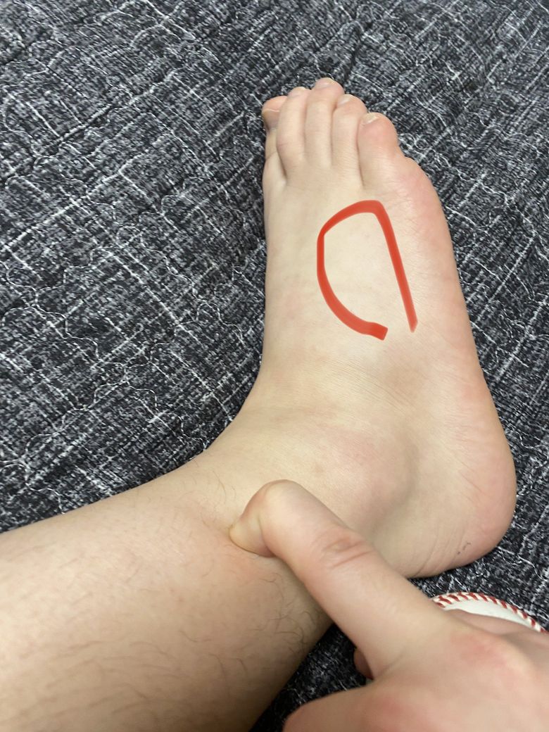 붉게 표시된 부분이 있는데 , 해당부위는 비골근 인대에 해당됩니다. 혹시 발목염좌 있었을 때 발목이 안쪽으로 꺾이진 않으셨나요? 안쪽으로 발목이 꺽이게 되는 경우 비골근에 염좌가 생기게 됩니다. 그리고 누르시는 위치는 비골근에 해당됩니다. 말씀하신 증상은 비골근과 연관이 있어보입니다