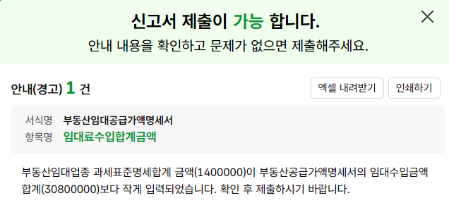 과세표준명세서 및 신고서 금액도 동일하게 맞춰주어야합니다.