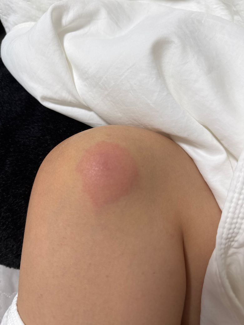 병변이 한군데 이고 주변으로 발적이 심한 상태이므로 두드러기보다는 벌레 물림에 의한