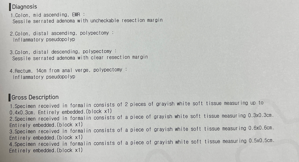 대장에서 용종 4개를 제거하셨고 2개는 선종이군요