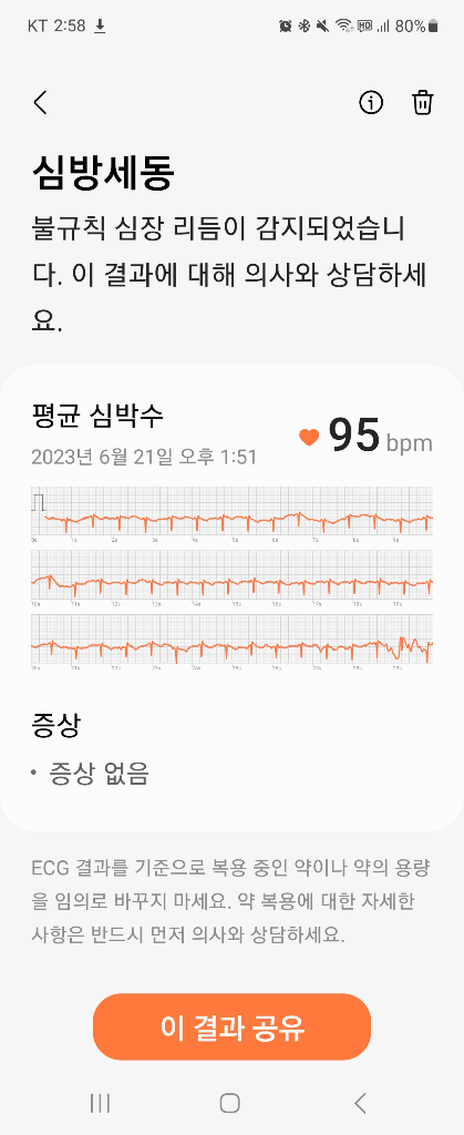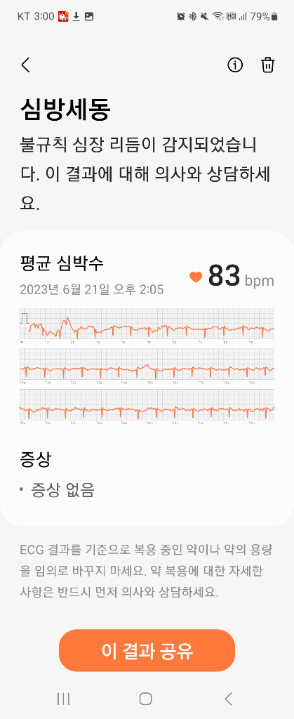 워치 결과만 가지고 심방세동(조동)여부를 알기 어렵습니다. 생활 심전도를 다시 받는 것이 좋습니다.