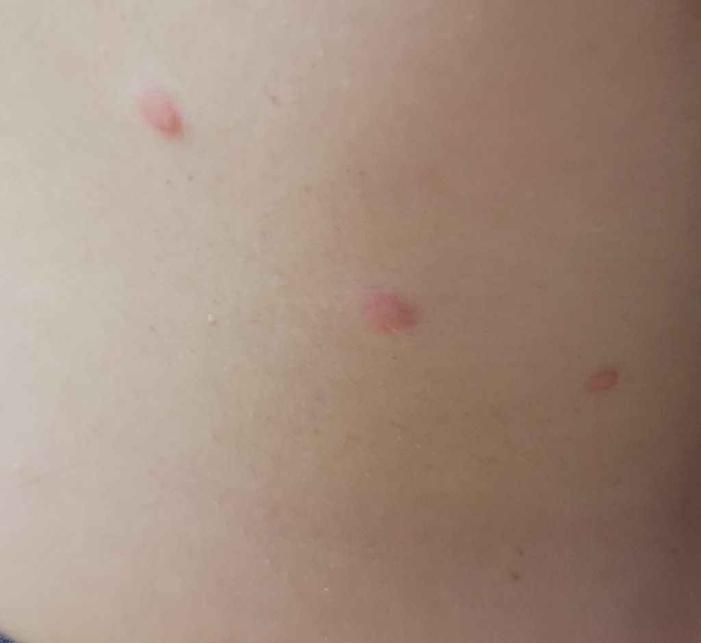 빈대 등은 사진과 같이 연속적으로 무는 경우가 있으며 발진과 함께 통증을
