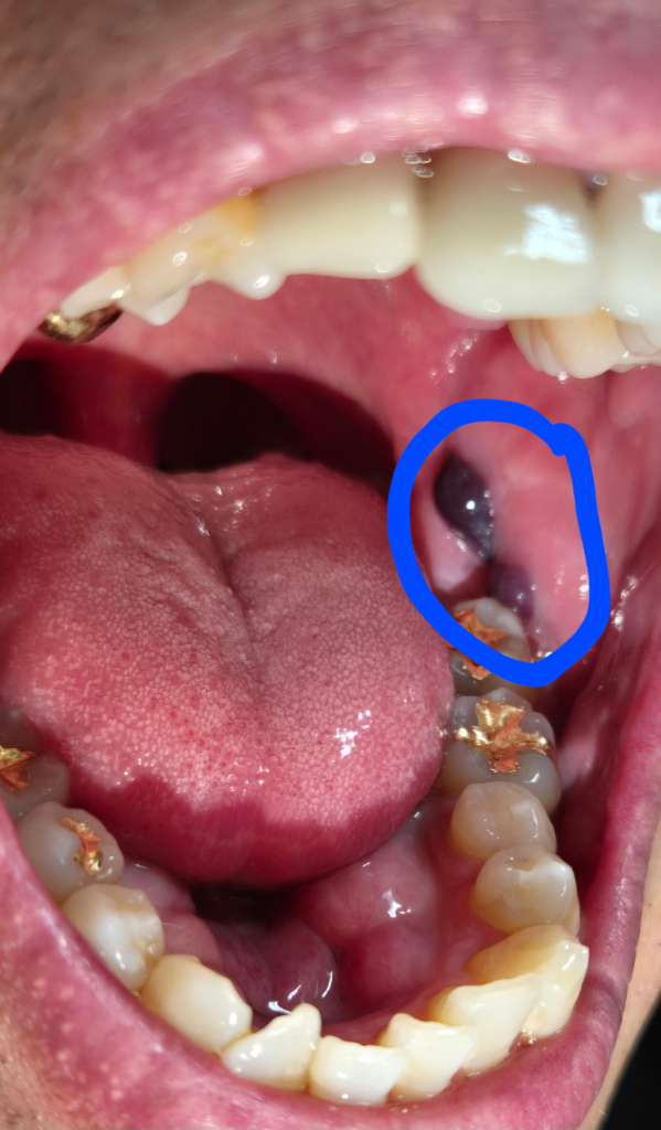 저부위는 물집이 아니라 볼살이 치아에 씹히면서 피가 뭉쳐 잇는거 같습니다. 터트리면될꺼 같아요.
