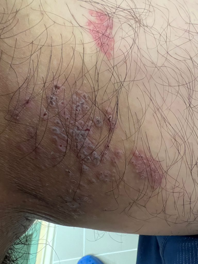 군집을 이룬 수포의 모습이 대상포진과 유사합니다. 피부과를 방문해 진찰을 받아보셔야 하겠습니다.