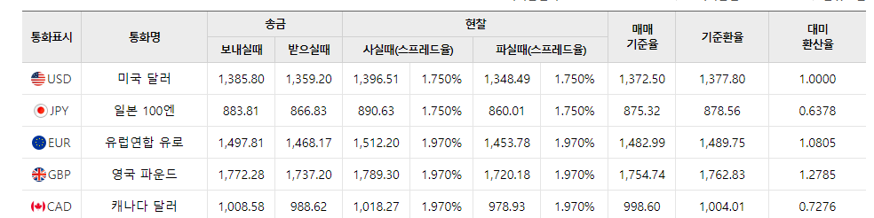 아래와 같이 실제 현금교환보다 송금, 수금을 하실때 스프레드가 더 낮습니다. 따라서 이러한 경우가 더 차이율이 적다고 보시면 됩니다