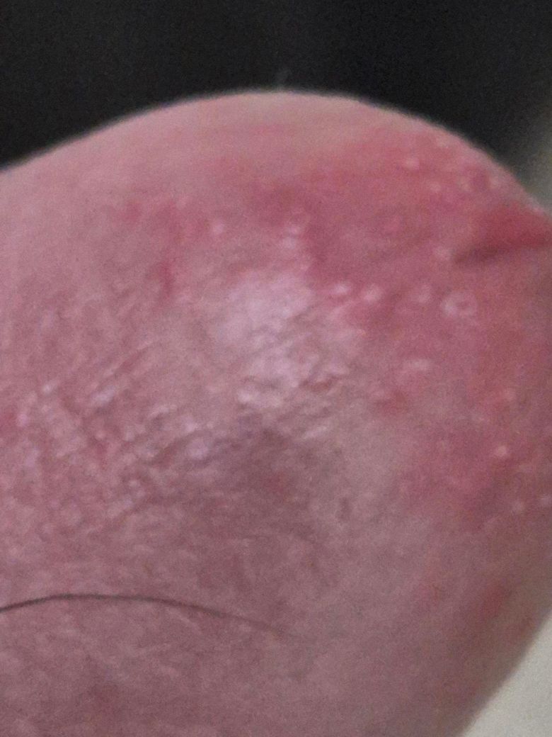 수포성 병변이 있으므로 최근 성관계가 있었다면 헤르페스와 같은 성매개성 피부 질환에 대한 감별이 필요합니다.