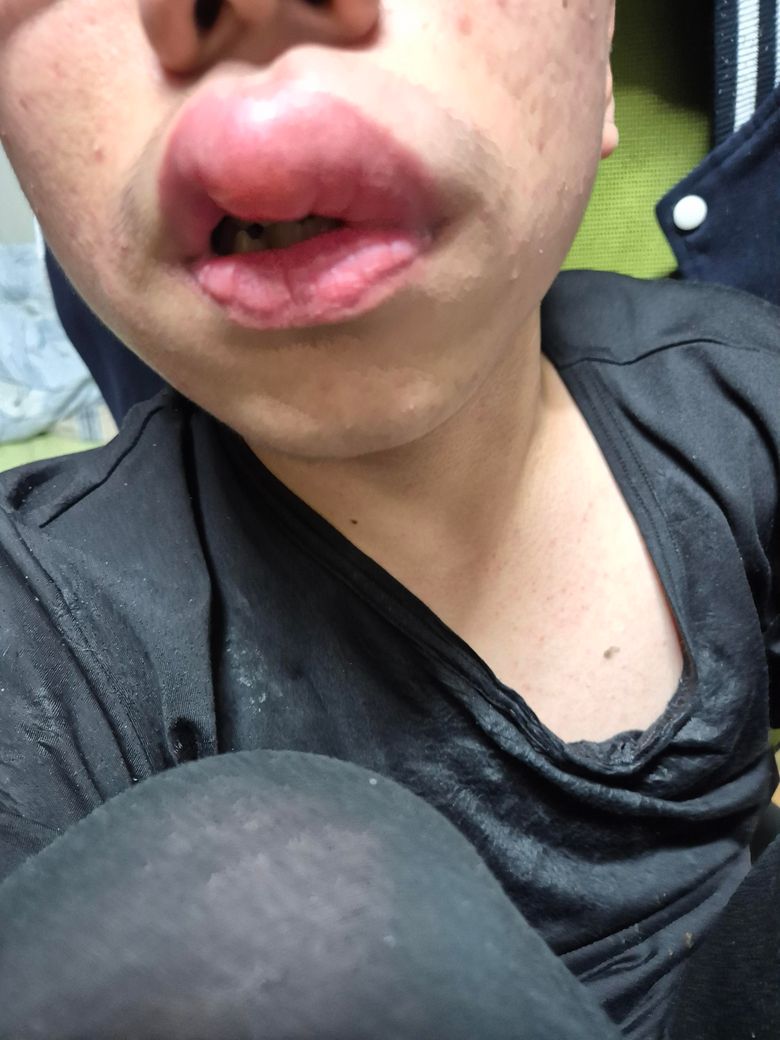 과민성 반응에 의해 입술고 눈꺼풀 부위 부종이 생기는 것이 전형적인 특징입니다.