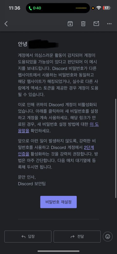 계정에서 의심스러운 활동이 감지되어 계정이 도용되었을 가능성이 있다고 판단되어 이 메시지를 보내드립니다. Discord 비밀번호가 다른 웹사이트에서 사용하는 비밀번호와 동일하고 해당 웹사이트가 해킹되었거나, 실수로 다른 사람에게 액세스 토큰을 제공한 경우 겨 정이 도용될 수 있습니다. " 라고 와있더라구요. 하ㅜ 빠르게 비번 변경에 Sms추가 2단계인증 싹다했는데 또한번 튕겨져 나가지고ㅜ 저 진짜 불안해 죽겠어요.