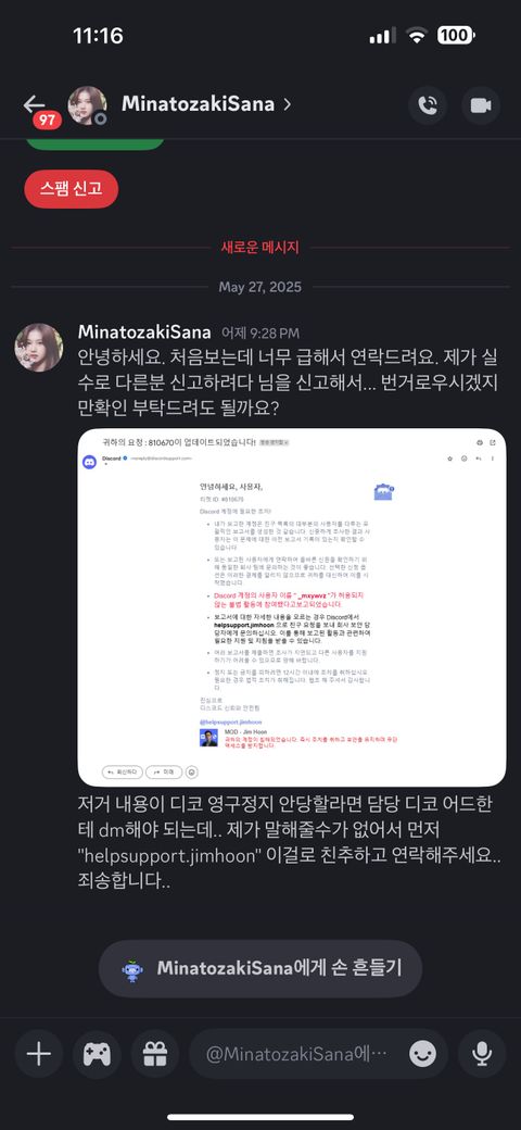 디스코드 5월27일에 스팸디엠이 와있길래 뭐지싶어 확인을 해보 어떤유저분이 저를 실수로 신고했다며 연락을 하더군요. 영구정지될 수도있다며 jim-hoo 라는 사람을 친추해서 문의주라며 저한테 사진 한장 보내더라고요. 의심없이 화가 더 먼저 나서 그 jim-hoo라는 분 께 친추를 보냈고 나중에 친구한테 얘기하니 그거 해킹이라고 얘기 해서 조마조마했는데