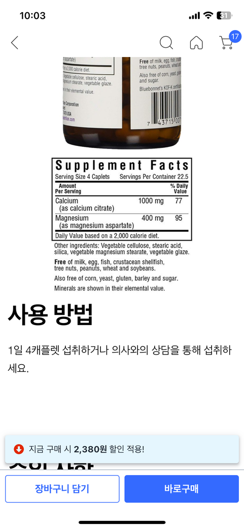 1) citrate 성분 칼슘과 aspartate 성분 마그네슘이 같이 들어있는 영양제를 하루 2알 복용 중입니다.(권장은 4알이나 2알 복용)