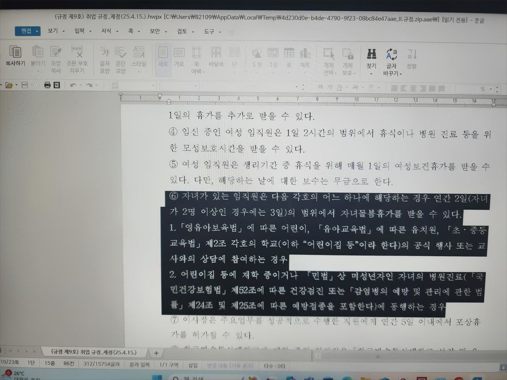 - 사진상의 내용은 취업규정 안에 특별휴가 자녀돌봄휴가 사용 규정입니다. 휴가 사용 조건은 담당자의 말에 의하면 국민건강보험법. 제52조에 해당하는 조건만 휴가사용 가능 하다입니다. 제52조 내용은 6세 미만의 영유아 건강검진 및 예방접종입니다. 명시되어 있는 민법 상 미성년자(만19세미만)인 자녀의 병원진료 동행하는경우 에 포함된다는 내용인데 어째서 제52조에 해당만 휴가가 사용 가능한지 이해가 되지 않습니다. 조금만 검색해보아도 자녀의 병원동행시 사용가능한데 말이죠. 좋은 답변 부탁 드립니다.
