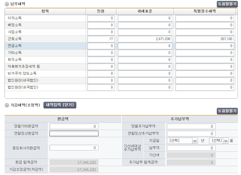 근로소득에 저 금액이 맞는 건지 연말정산환급액에는 20,017,130원을 입력하면 되는 건가요?