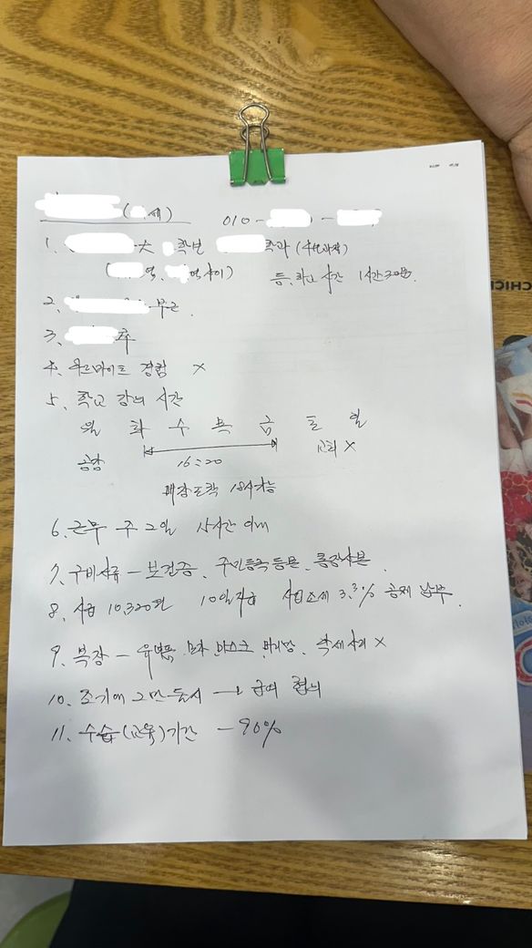 1. 사진은 사장님이 근로계약서라고 주장하시는 종이인데 싸인도 안하고 저는 아무것도 쓴게 없는데 근로계약서 효력이 있는걸까요? (면접보면서 사장님이 메모한 내용입니다. 개인정보만 가렸습니다.)