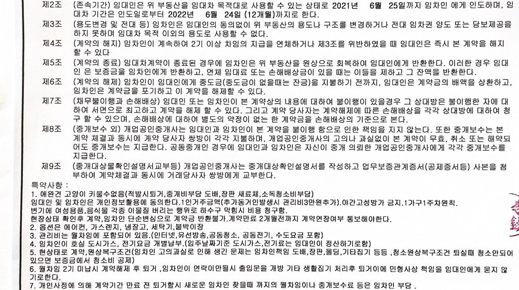 따라서 계약 21.6월~23.6월 2년의 계약 기간 중에, 임차인의 사정으로 중도에 계약을 해지하려면, 임대인의 동의를 받아서야 가능합니다.