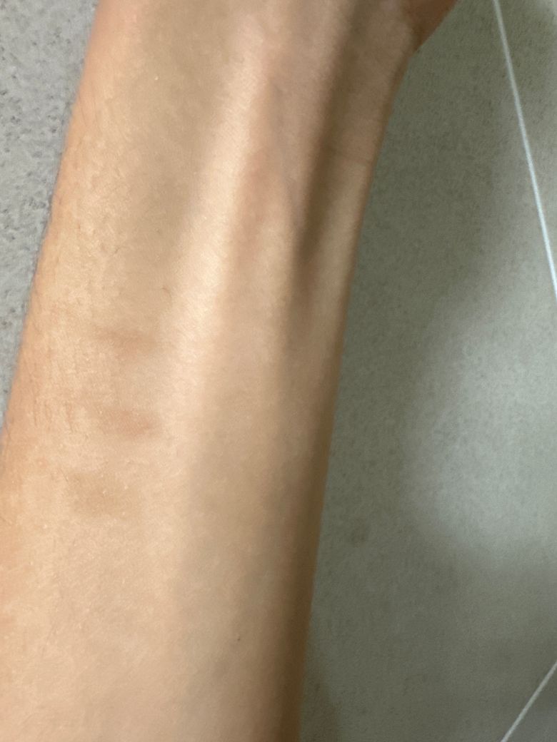 손목에 꽉 쥐어진 자국이 오래 가시네요.3주정도 되었다면 멍이 든것 같습니다.시간이 지나면 없어집니다