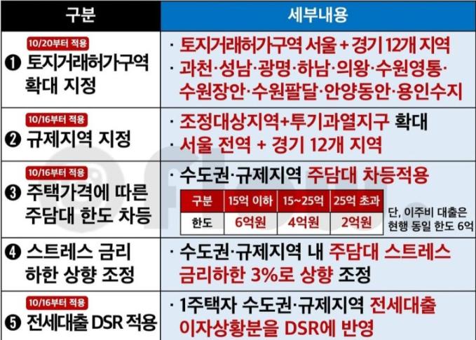 10월15일 정부에서 주택시장 안정화 대책을 내놓았는데, 그 주요 사항은 서울전역과 경기 12개 지역이 16일부터 조정대상지역 및 투지과열지구로 지정되며 20일부터 이들 지역이 모두 토지거래허가구역으로 지정되는 것입니다. 수도권과 규제지역에 대해 주담대한도를 시가15억 이하인 경우에는 6억을 유지하고 시가15억~25억은 4억, 25억 초과시는 2억으로 제한하며, 수도권과 규제지역에 대해 스트레스 금리를 1.5%에서 3.0%로 상향하고, 10월 29일부터 1주택자가 수도권 및 규제지역에서 임차인으로 전세대출을 받는 경우 이자상환분에 DSR을 반영합니다.