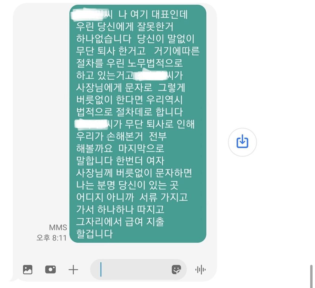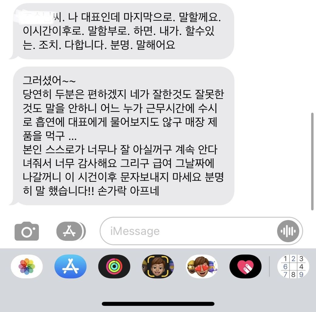 그러던 와중 남자대표님에게 너 집 아니까 한 번만 더 여자사장한테 버릇없게 하면 찾아오겠다 문자를 받았습니다.