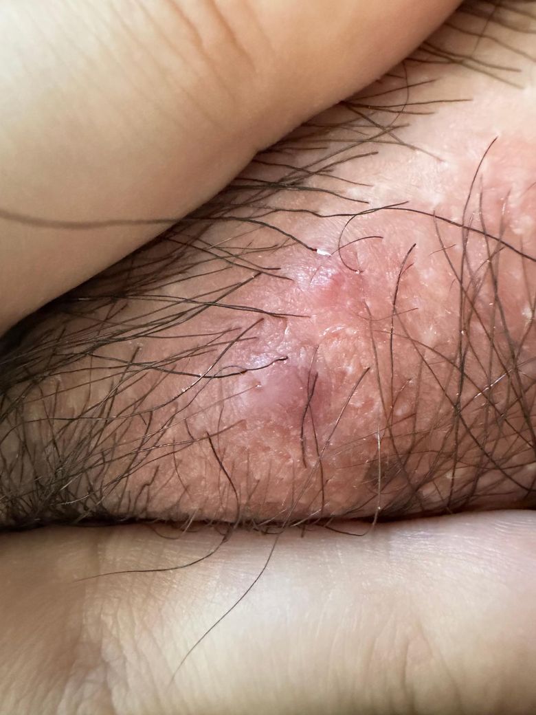 헤르페스·매독 같은 성병 병변은 보통 물집, 짓무름, 지속적인 통증, 번짐, 열감, 반복 경과가 나타나는데 지금 사진은 털이 있는 부위의 국소 염증 + 건조 + 마찰에 의한 붉은 멍울 패턴에 더 가깝습니다.