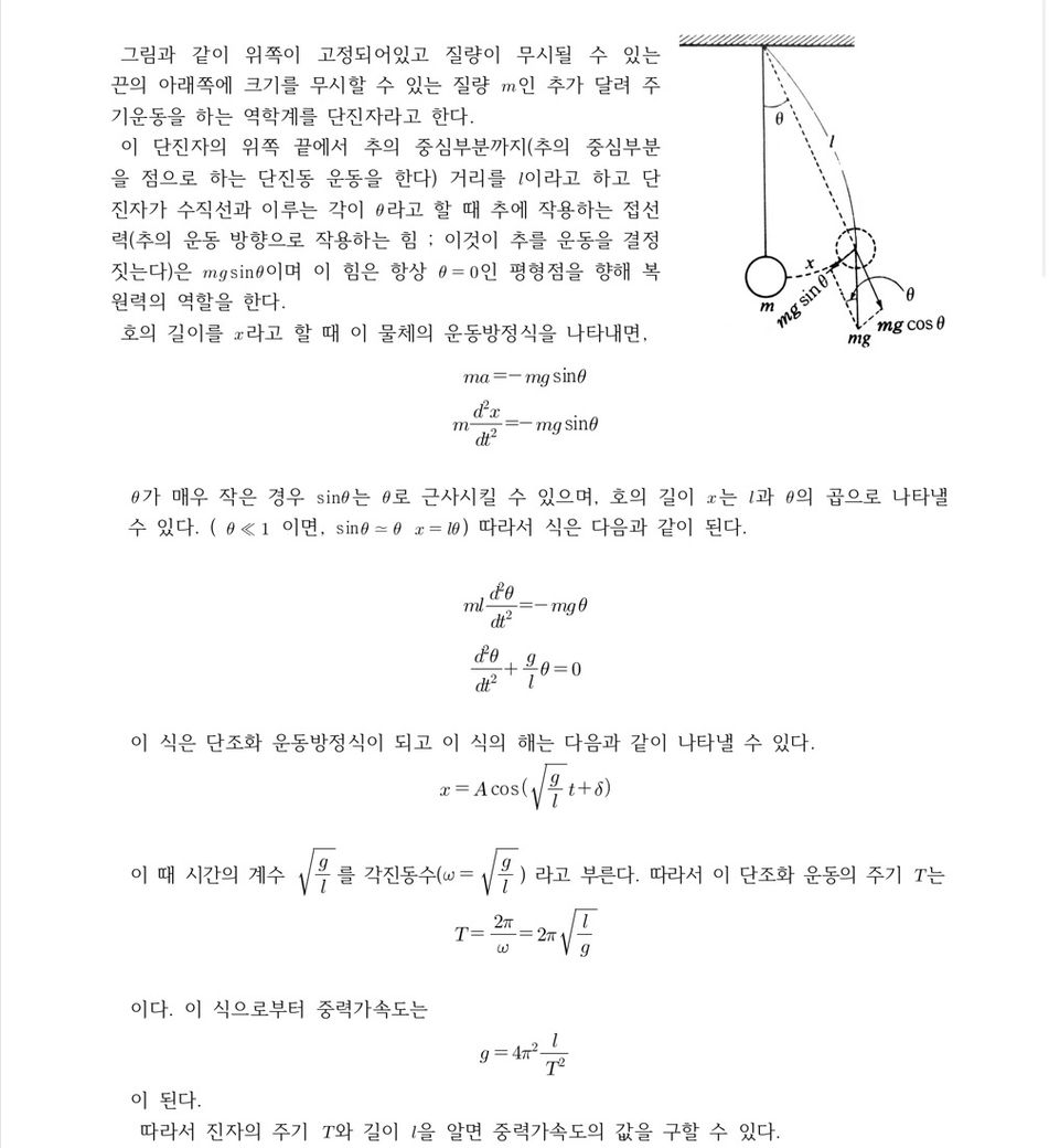 단진자를 이용한 중력가속도 측정에서 공식이 어떻게 유도되는지 궁금합니다