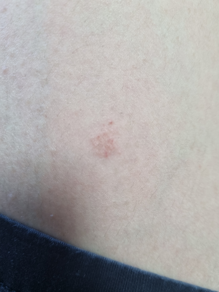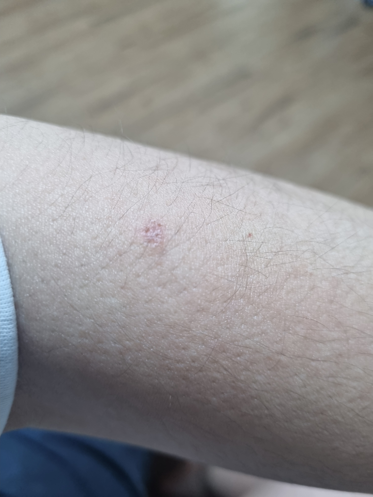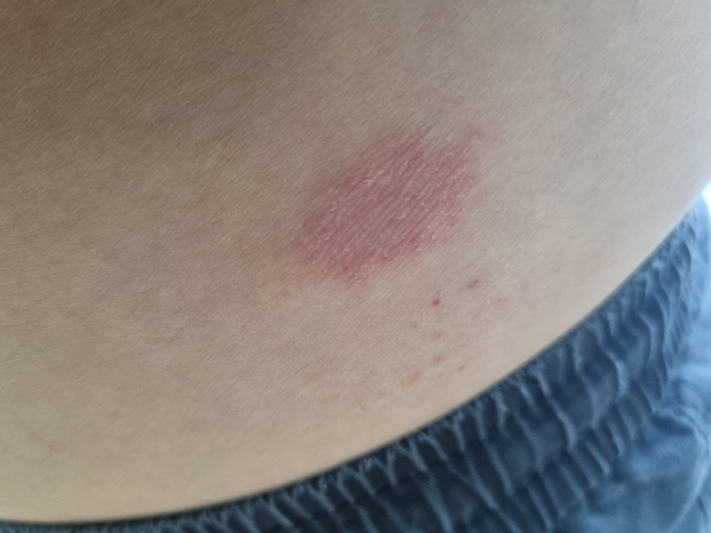 습진성 병변이 관찰됩니다. 수 주째 사라지지 않고 존재하는 경우 만성적인 문제를 추정해보아야 하겠으니 피부과 진료를 받아보시기를 권해드립니다.