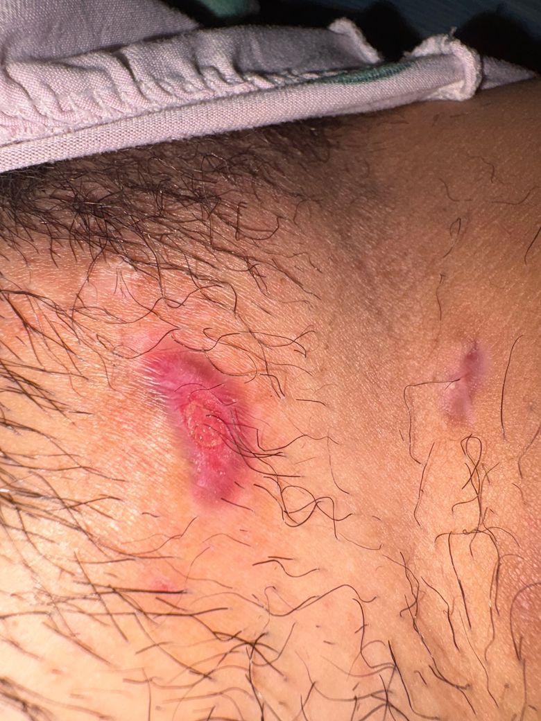 사진상 모낭염과 같은 국소 염증성 피부 병변이 발생하였고 제대로 치료가 되지 않아 농양이 반복되면서 피부 손상이 발생한 것으로 판단됩니다. 모낭염이 발생하게 되면 항생제를 이용하여 치료를 하게 되며 호전이 되지 않거나 농양으로 진행하면 배농을 하여 치료를 하게 됩니다. 올려주신 사진상 헤르페스 감염에서 관찰되는 수포성 병변이나 곤지름에서 관찰되는 사마귀 양상의 병변이 아니므로 성관계로 인한 성매개성 피부 질환으로 보기는 어렵습니다. 산부인과나 피부과 내원하여 진료를 보시는 것을 권해드립니다.