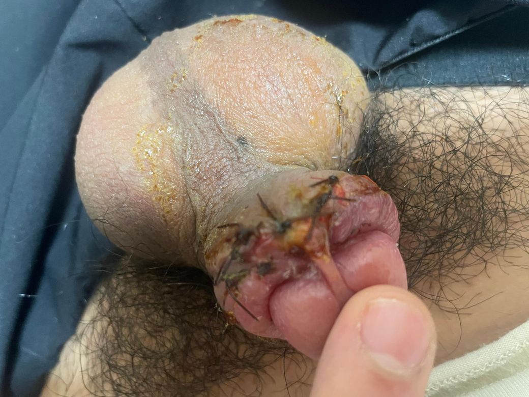 상처는 잘 회복되는 중으로 보이나 올려주신 사진만으로는 정확히 알기 어렵고 직접 신체 진찰이 필요하므로 진물이 계속된다면 다시 비뇨기과 진료를 받기 바랍니다.