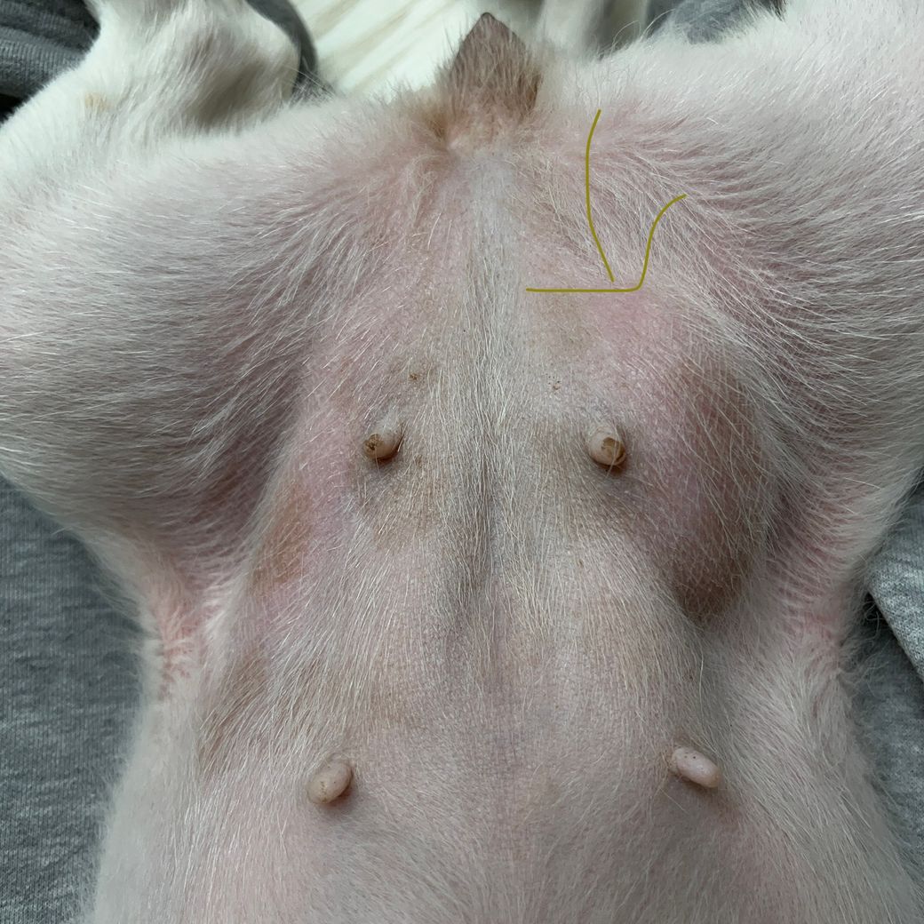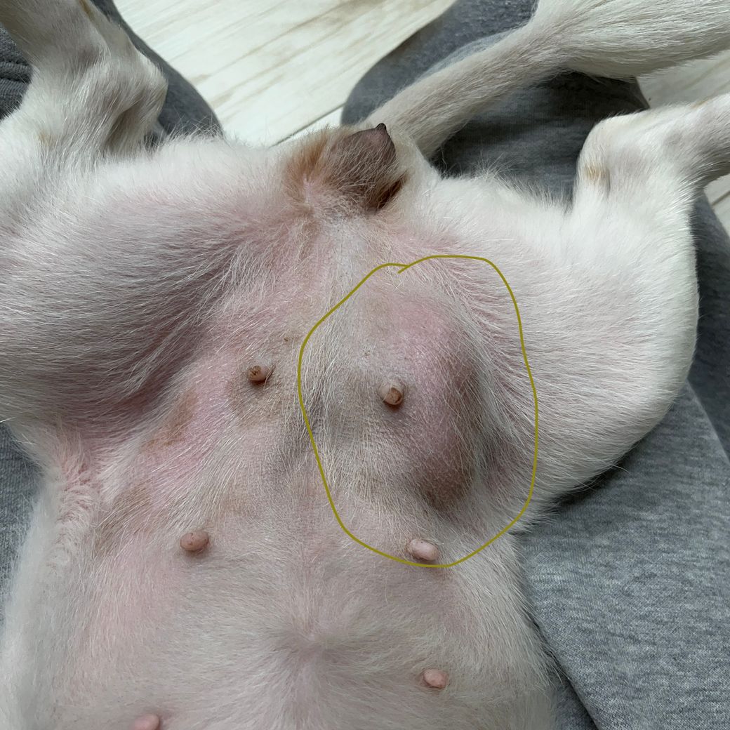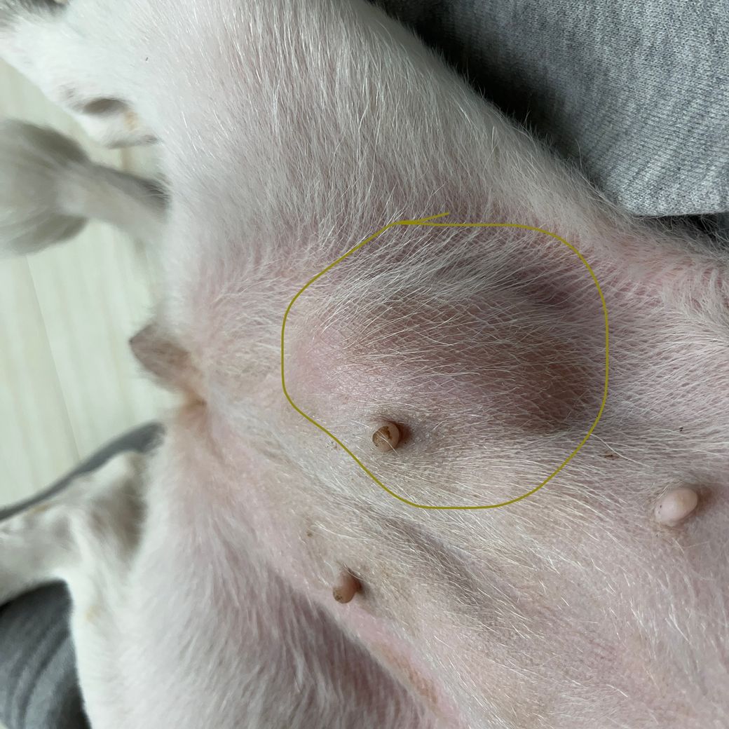 해당부위는 유선종양 호발 부위이기도 하지만 서혜부 허니아가 유발되는 칼집구멍 위치에 해당하여 허니아 가능성도 있습니다. 동물병원에 데려가서 확인 받으시기 바랍니다.