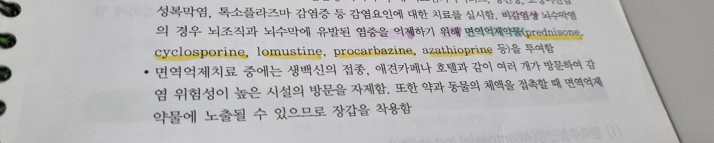 비감염성 뇌수막염은 체내에 있는 면역세포들이 공격하는 질환입니다. 즉 자가면역질환이라고도 하죠. 자가면역질환은 스스로 면역세포들이 스스로를 공격하여 염증이 발생하는 것이므로 면역을 억제시켜주어 염증반응을 가라앉힙니다.