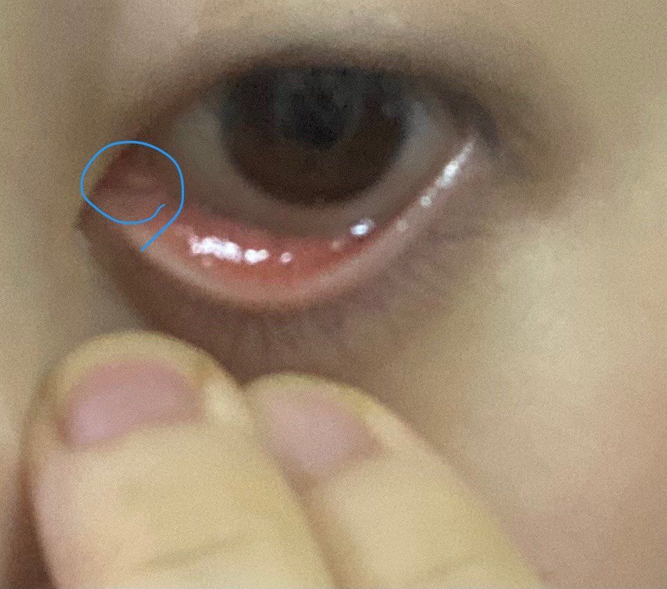 질문하신 내용에 대하여 아래와 같이 답변 드립니다.안쪽 눈꺼풀 점막입니다. 크게 신경안쓰셔도 됩니다.