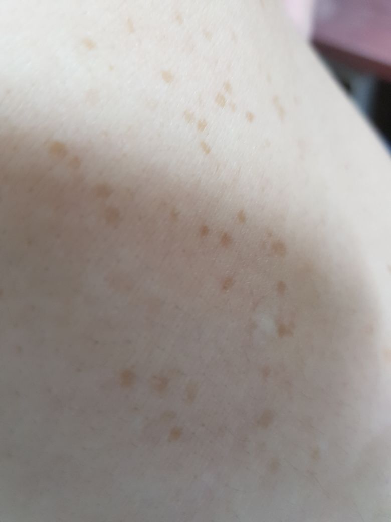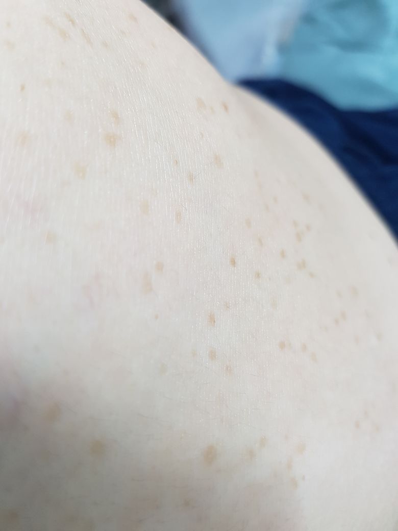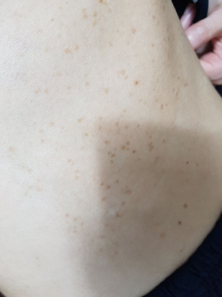 반점들은 왼쪽 옆구리까지 퍼져있습니다.