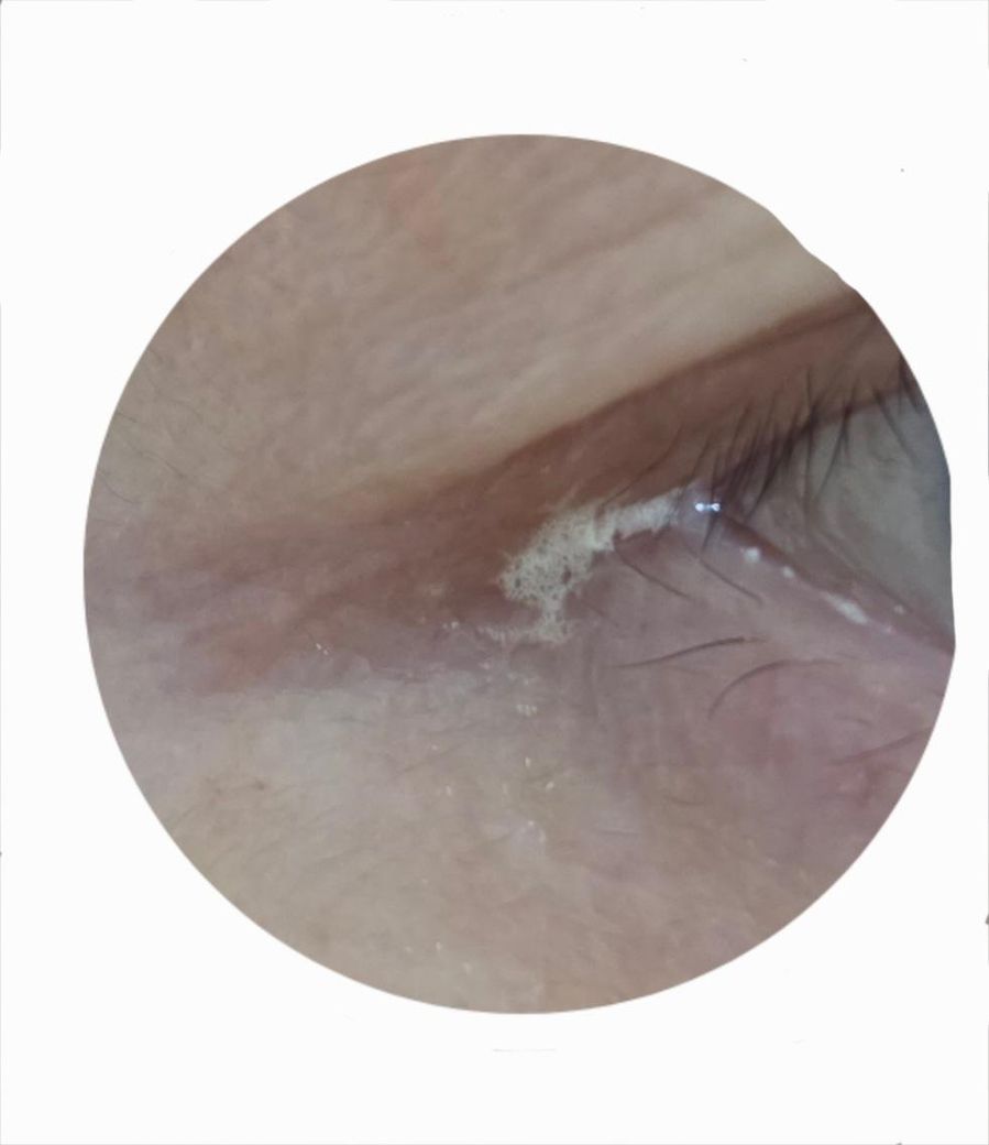 임상적으로는 안구건조증 또는 눈꺼풀염 범주에서 흔히 보이는 소견입니다. 눈꺼풀 가장자리의 기름샘 기능이 떨어지면 지방층이 불안정해지고, 그 결과 점액성 분비물이 증가해 이런 형태가 됩니다.