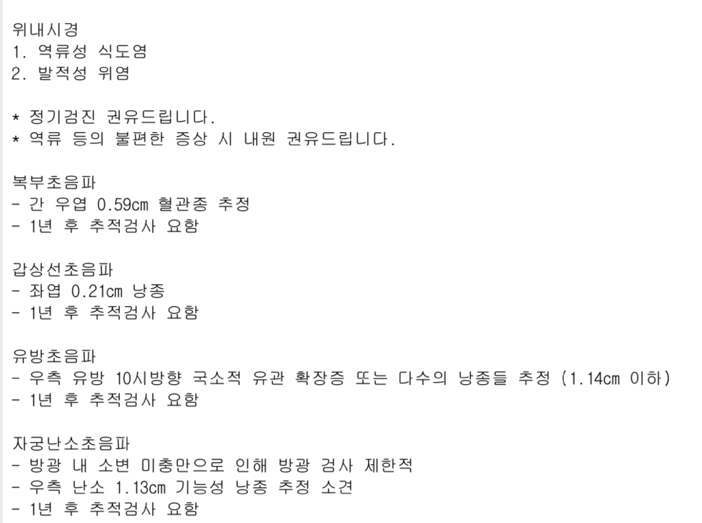 각각의 항목에 전부다 1년뒤 추적검사 요합니다라고 권고사항이 되어있기 때문에