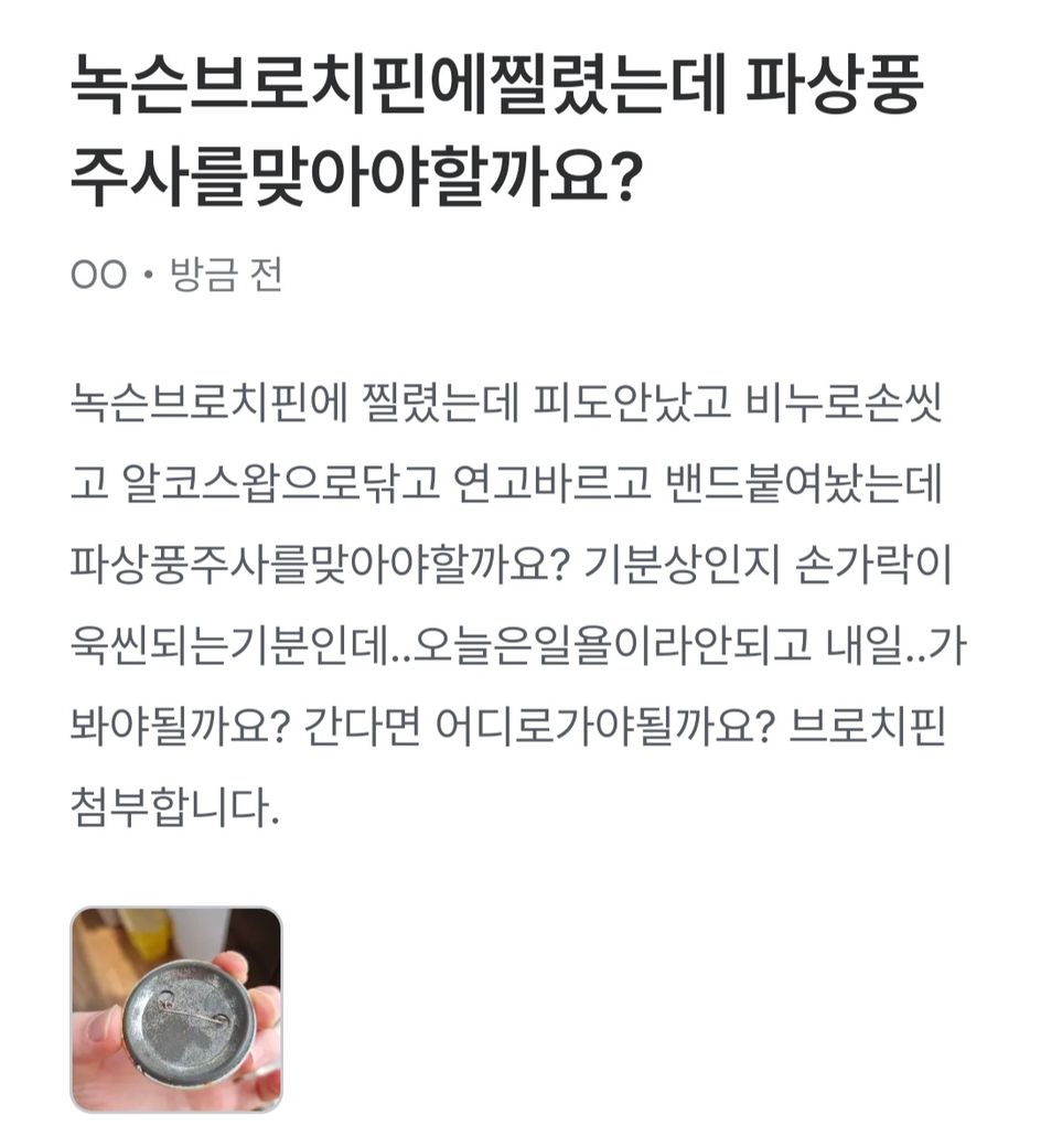 녹슨브로치핀에찔렸는데 파상풍주사를맞아야할까요?