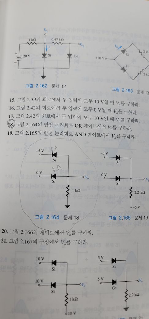 18번 그림 2.164의 반전 논리회로 OR게이트에서 v0를 구해주세요 si의 문턱접압은 0.7v에요!! 그리고 다이오드가 동작되는 회로 설명 부탁드립니다..