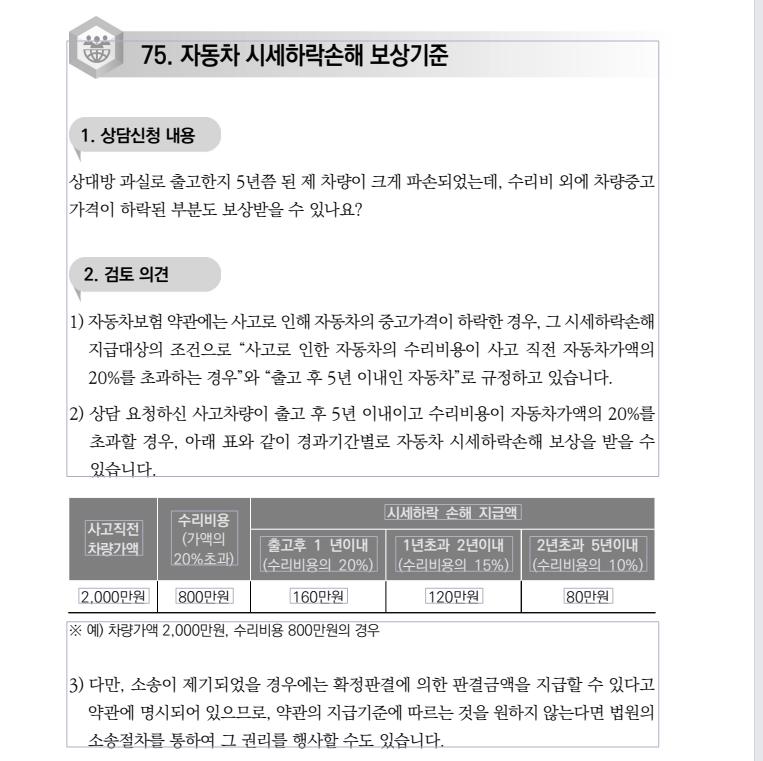: 자동차보허에서 시세하락 손해는 출고 5년이내의 차량이 사고당시의 차량가액의 20%를 초과하는 수리비가 발생할 경우 보상이 되는 것으로,