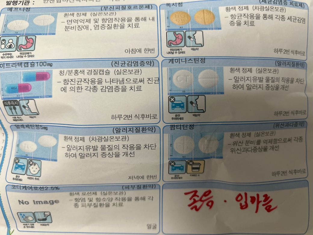 특히 위 항생제(독시정)은 여드름에 사용되는 약물로, 1주일 사용 가능하십니다.