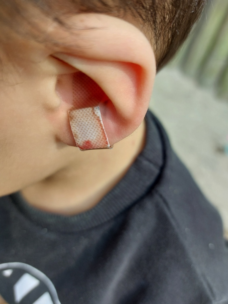 상처로 봐서는 베인 뒤에 약간의 타박상 형태의 멍이 생긴 것으로 보입니다. 대개 시간이 지나면 멍은 자연스럽게 사라지는 경향성이 많기는 하나, 점점 더 상처부위가 커진다면 이비인후과에 가보실 것을 권유드립니다.