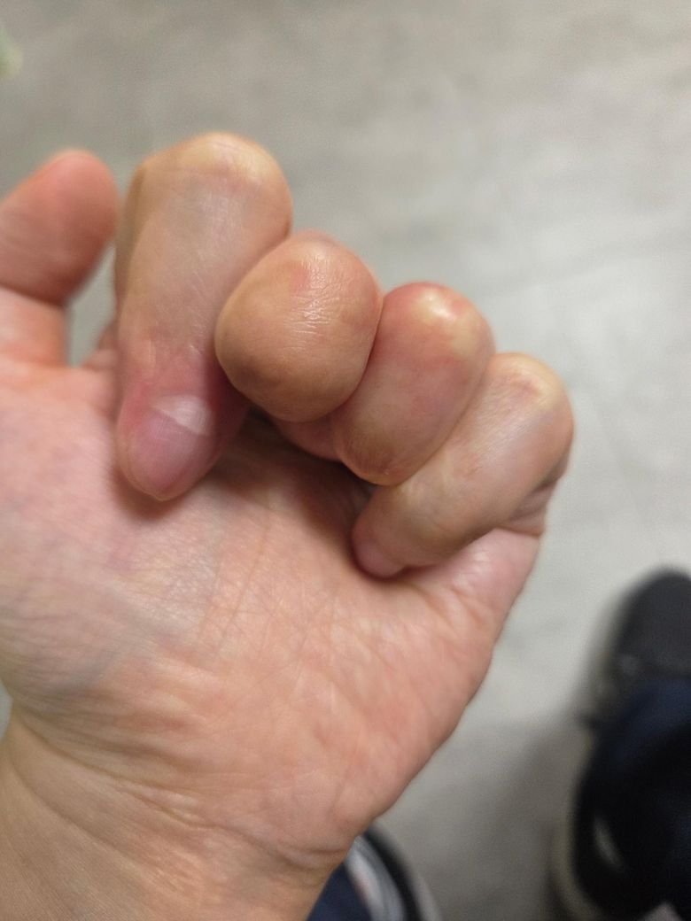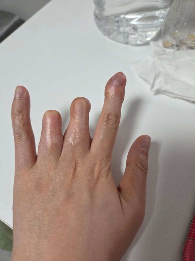 한 손의 둘째손가락을 포함하여 세 손가락의 기능에 상당한 장애가 있는 사람