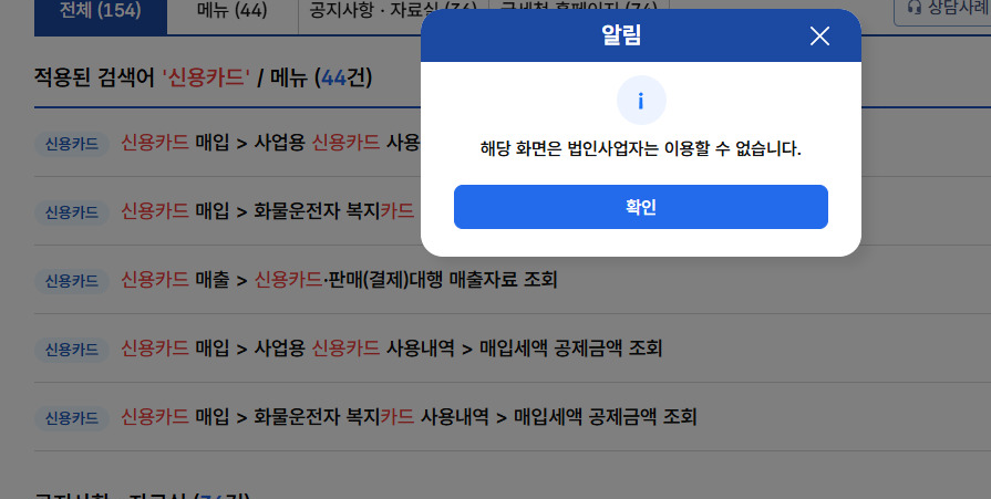 법인사업장입니다. 홈텍스에서 사업용 신용카드 매입내역 조회하려는데 오류가 뜨는데