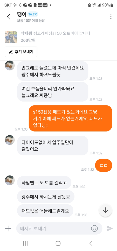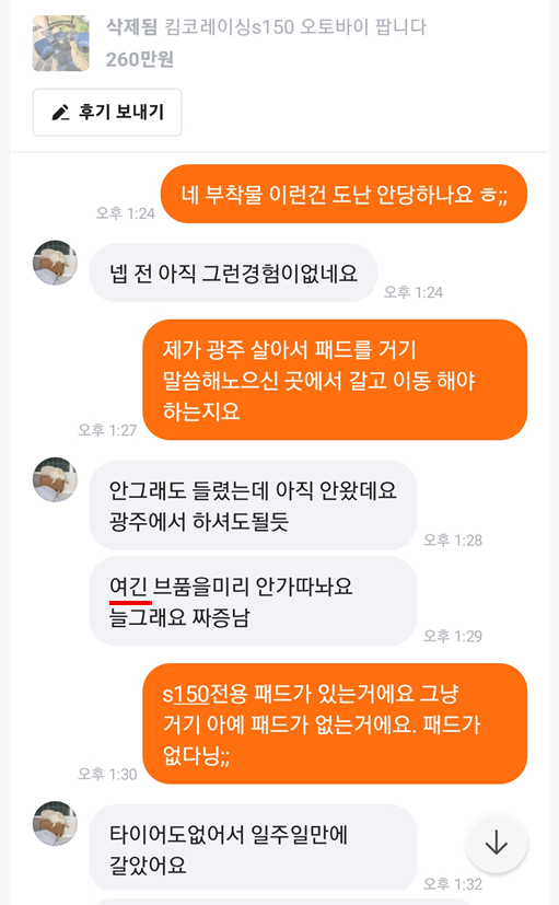 판매자와 구매자 대화중 부품 패드는 여기 매장이 부품을 잘