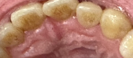 치아 안쪽면에 치석 및 충치가 있어 보입니다. 우선 빠른시일내에 치과에 방문하여 치료를 받고 양치는 매번 식사후에는 하길 권합니다.