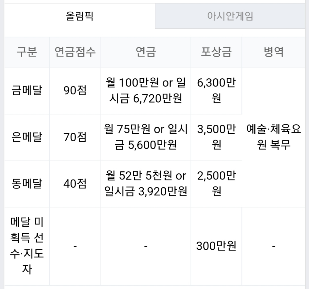 금메달 연금은 월 100만원과 포상금 6300만원입니다.