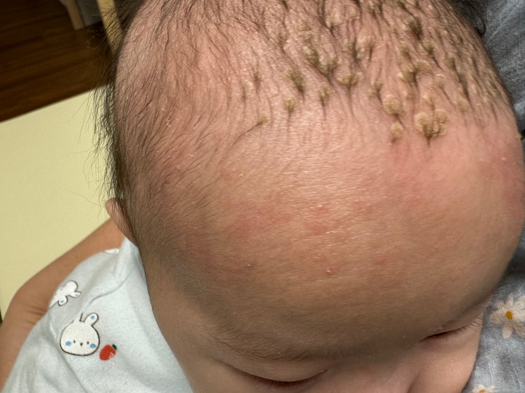 태열 등으로 인한 증상일수도 있지만 지루성 피부염 등의 가능성도 있어 피부과 및 소아과에 내원하시어 진료를 받아보시는 것을 추천드립니다.