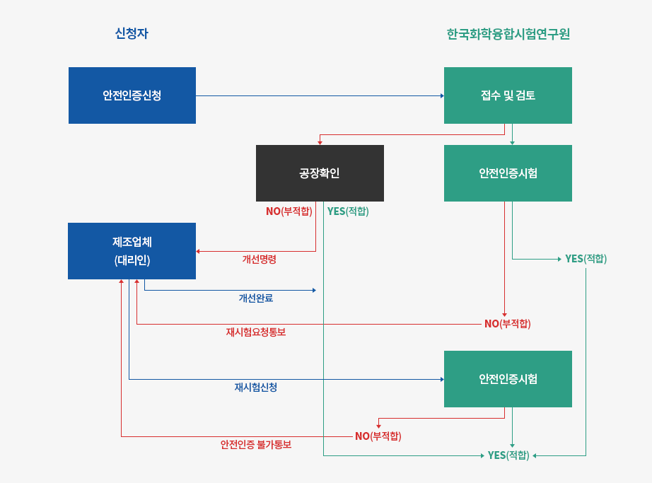 가. 처리절차 : 시험접수(시험기관) → 제품시험 및 성적서 발급 → 안전확인 신고서작성 → 신고내용확인(인증기관) → 안전확인신고 증명서 작성 → 안전확인신고 증명서 발급
