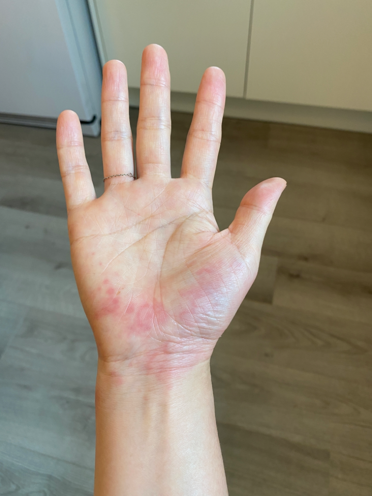원래 알르레기 체질이고, 접촉성피부염도 잘 생깁니다. 체온이 오르면 열꽃도 잘 생기는데 보통은 두드러기가 몸이나 얼굴에 모기 물린것 처럼 부풀다가 몇시간내로 사라지는데 이번엔 손바닥이 가렵기 시작하더니 손바닥 손등 손가락에 빨간 테두리가 보이는 두드러기가 생겼습니다. 첫날은 불이 날듯 가려웠고 둘째날 가라앉는 것 같아 병원을 안갔는데 3일째에도 위치가 조금씩 바뀌며 여전히 진행중이예요. 수포는 없어요. 최근에 비염(코막힘,콧물)이 심해져 비염약,항알러지약,가래약 처방받았고 원래 먹던 약입니다. 약 때문일까요? 처방받은 내과를 가야하나요? 피부과를 가야하나요? 처방약을 먹기전날에 열이 올라 새벽에 깼었고 손바닥에 붉은점이 약간씩 보이긴 했습니다.