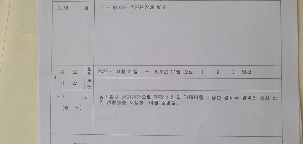 회사 지정 병원으로 가서 mri찍고 디스크가 신경이 누르고있어서 허리시술을 했습니다. 코드는 m518 나왔습니다.