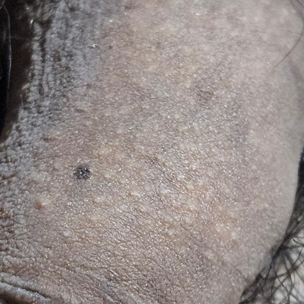 사진상 작은 구진성 병변이 다발성으로 관찰되면 일부 노란색과 흰색 병변이 혼재되어 있어