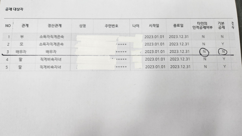 다만 타인의 인적공제?? 이부분 N으로 체크 되어있는데.. 무슨의미인지 모르겠어요.