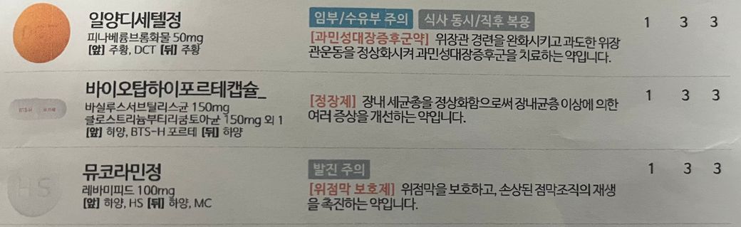 처방받으신 약인 피나베륨(Pinaverium) 성분의 일양디세텔정 / 유산균 성분의 바이오탑하이포르테 캡슐 / 레바미피드(Rebamipide) 성분의 뮤코라민정은 과민성대장증후군을 비롯한 복통증상에 복용하실 수 있는 약입니다. 일반적으로 비닐 포장으로 조제된 약은 조제일로부터 6개월 이내에는 복용하실 수 있습니다. 약이 적절한 온도와 습도 조건에서 잘 보관되었다면 복용하셔도 괜찮습니다.